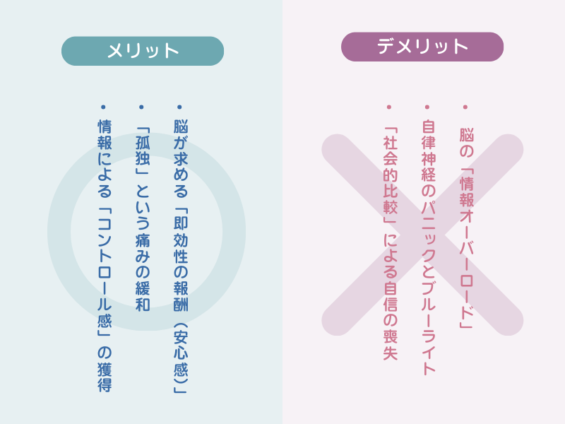 - 焦燥感(FOMO): ネットの話題に付いていけないと、社会から取り残されるような強い不安を感じる。