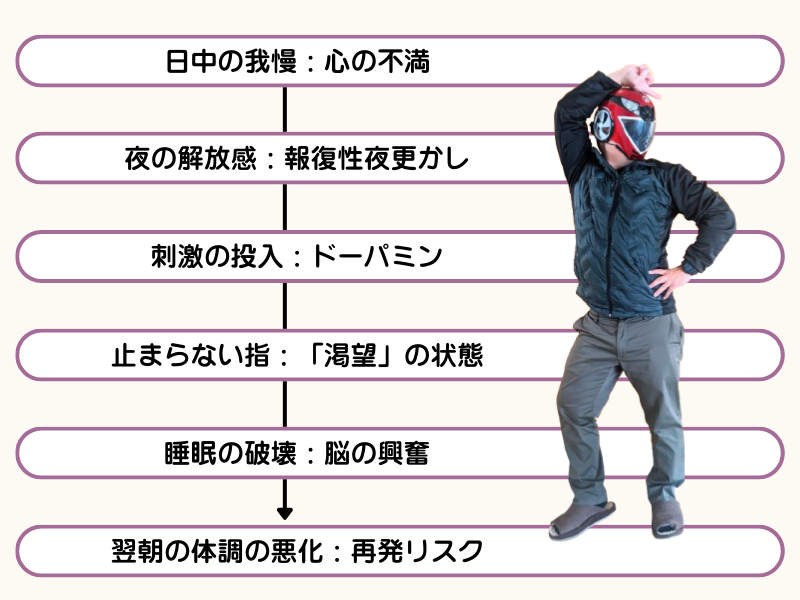 特に体力が低下している時期や、メンタルが敏感な時期は、この刺激に脳が振り回されやすく、自分では止めたくても止められない「依存状態」に陥りやすいのです。