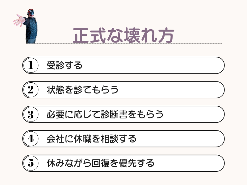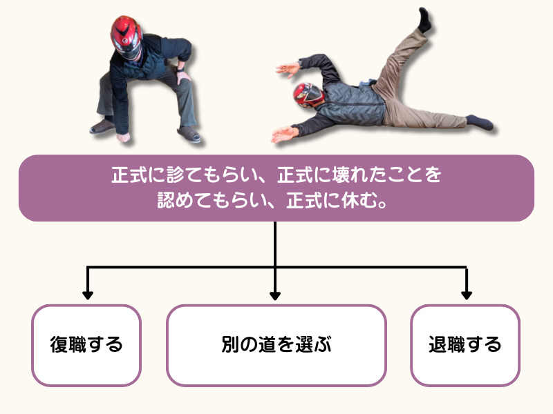 この受診 → 診断書 → 休職の流れが、いわば「正式な壊れ方」です。