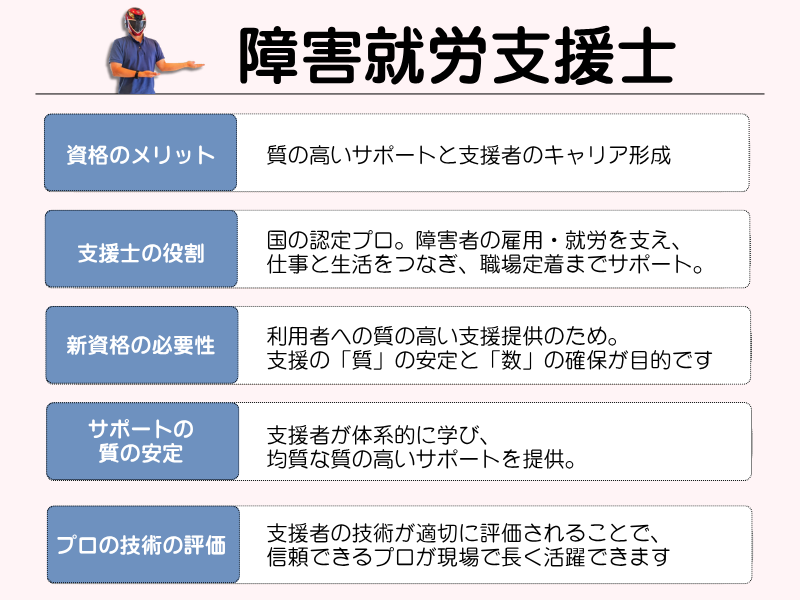 - 障害者就労支援士: そのサービスを含め、皆さんの働く全てを支えるプロの技術を証明する「資格」のこと。