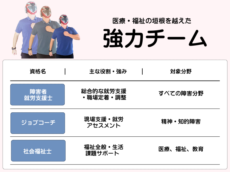 | 7 | サポートチームのまとめ役 | 就労移行支援などの福祉サービス、病院など、さまざまなサポート機関と連携し、あなたに最適な最強チームを作ります。 |