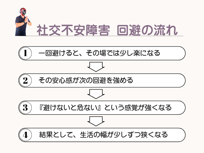 不安を感じる場面を避けると一時的には楽になりますが、その回避が積み重なると『やっぱり自分には無理だ』『また失敗するかもしれない』という感覚が強まり、不安の範囲が広がっていきやすいと説明されています。