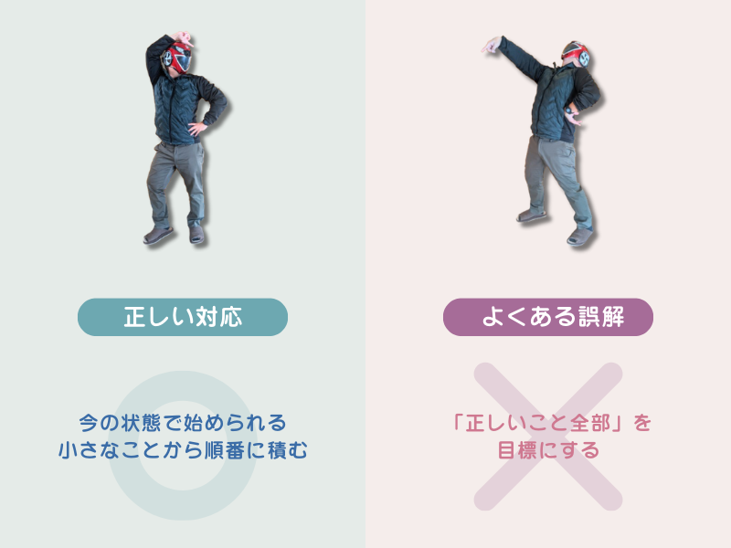 「正しいこと全部」を目標にするのではなく、今の状態で始められる小さなことから順番に積む。これが、この記事全体の前提です。