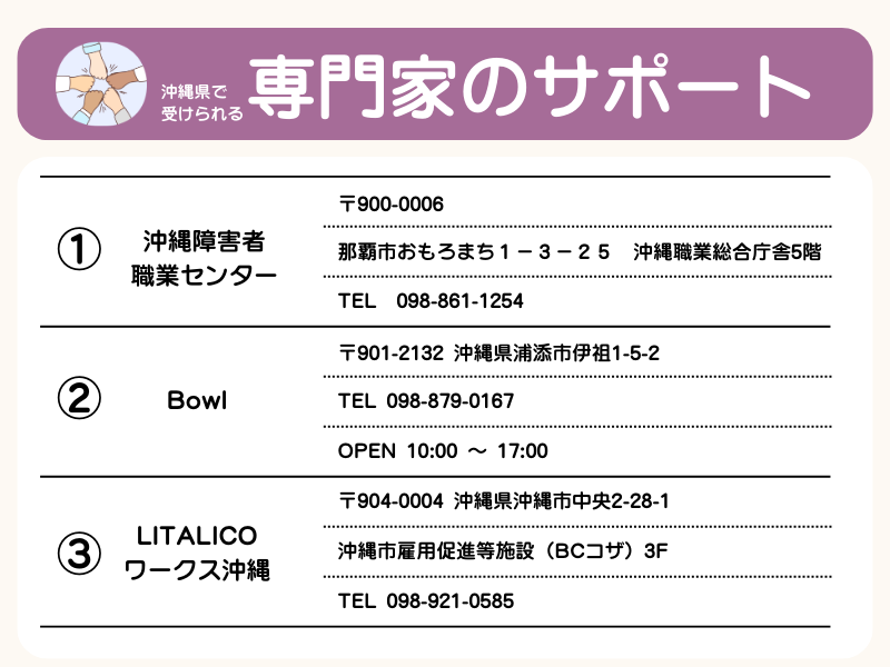 民間の選択肢としては、2013年に沖縄で初めて民間リワーク支援事業を立ち上げたBowL(浦添市)、就労移行支援と復職支援の両方に対応するLITALICOワークス沖縄(沖縄市)があります。